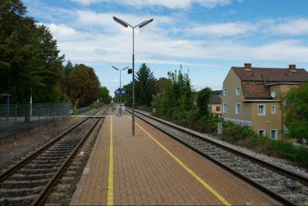 Leider kein wettergeschützter Wartebereich, wäre vorhanden, aber auf Grund von Vandalismus geschlossen! Sonst sehr idyllisch, Bahnviadukt, eingleisige Strecke.
